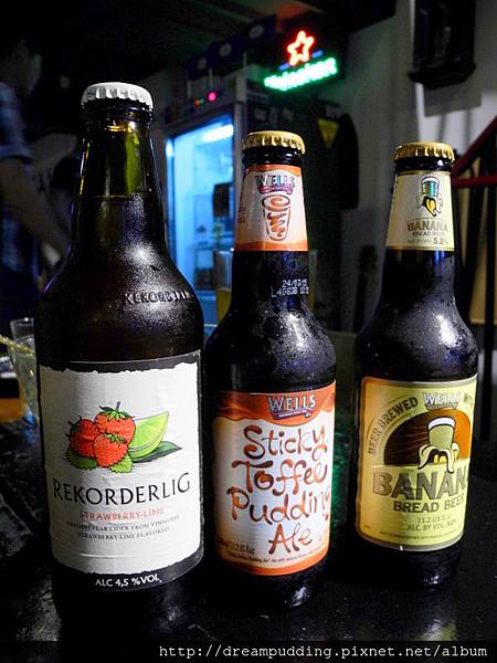 Tunnel 75販賣的酒類也很特別,像有系列是釀造類的水果啤酒,把麥改成水果,所以酒味不濃,但香氣十足,口感很特殊,由左至右為草莓萊姆酒、太妃糖布丁啤酒以及香蕉麵包啤酒,我們三款都好想喝,但是我們酒量都不好,很怕喝醉了大家會搶著要把優質男小柏帶回家,所以為了優質男小柏的安全著想,最後我們開了一瓶來自瑞典的草莓萊姆酒,這瓶也是Tunnel 75的外場人員18最推薦的。