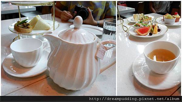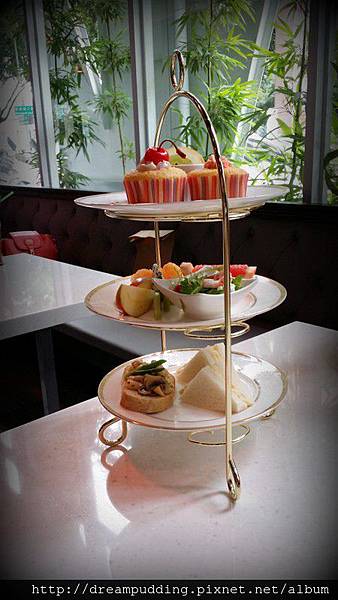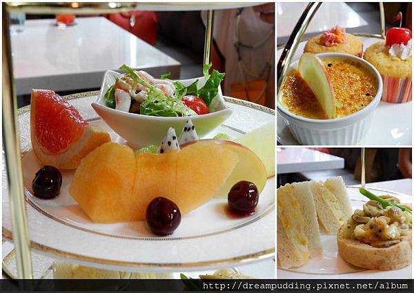 一層是水果跟沙拉,旁邊附的酒釀櫻桃有點微醺;一層是杯子磅蛋糕,口感微甜清爽蓬鬆很不錯吃;一層是三明治,都是輕食類。