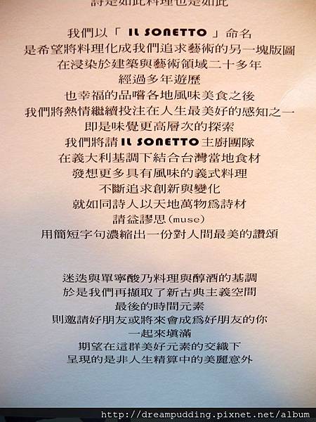 IL Sonetto聖娜朵是以義大利十四行詩來命名,共同喜愛藝術及文學的老闆跟老闆娘,為了讓對藝術跟文學的熱情付諸實現,而建立了IL Sonetto聖娜朵。