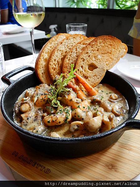 黑松露白酒燴蘑菇烹蝦,這個好吃,滿滿的菇配上松露烹調口感濃郁帶脆甜,搭著烤過的香酥麵包片一塊吃口感很讚!