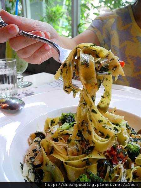 清炒田園羅勒寬麵,寬麵美得像緞帶似的。