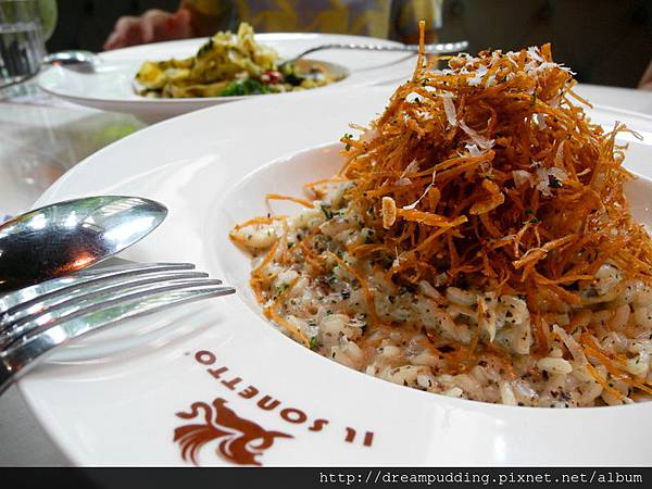 松露野菇燉飯,燉飯有一些些米芯,所以有些微嚼勁,上面的炸金針菇好爽口又涮口。
