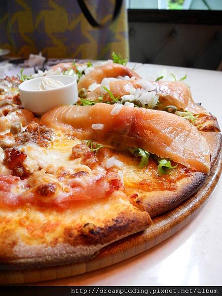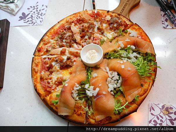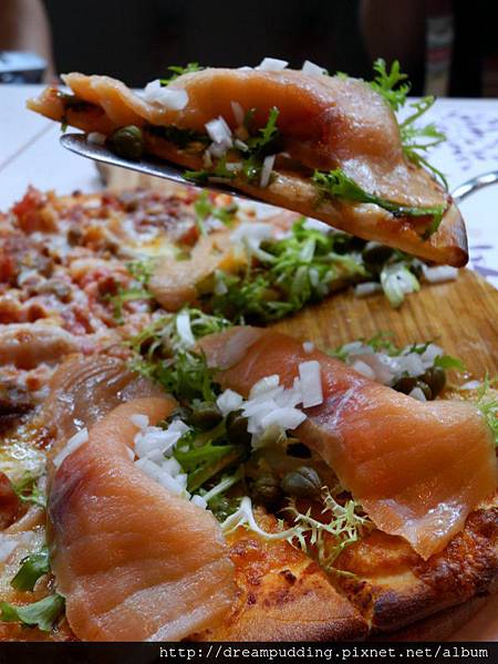 鮭魚都給得很大片,蓋住整片披薩了,餅皮是薄脆的,還有新鮮的生菜跟洋蔥丁增添爽口度,不過我還是覺得有點略油。