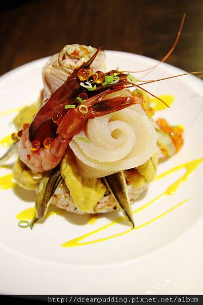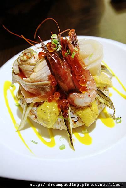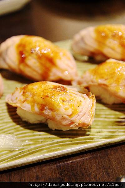 主廚創意料理,在鮭魚上抹上一層焦糖再下去炙烤,富含油脂的鮭魚表面變的微脆,吃下去就像是焦糖烤鮭魚布丁,咀嚼後是鮭魚的油脂併發融化,帶一點甜美跟炙燒的香氣,這一道我很喜歡,正妹服務生說很受女性顧客歡迎,但是索爾哥不喜甜就比較沒那麼喜愛,那你為什麼吃的比我多貫呢