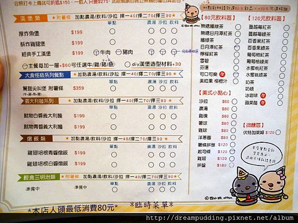 店內有漢堡、義大利麵跟燉飯還有一些小點心,義大利麵跟燉飯目前只有青醬跟白醬。