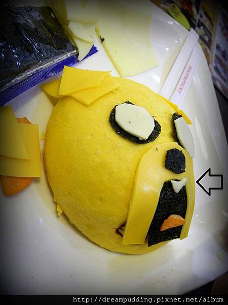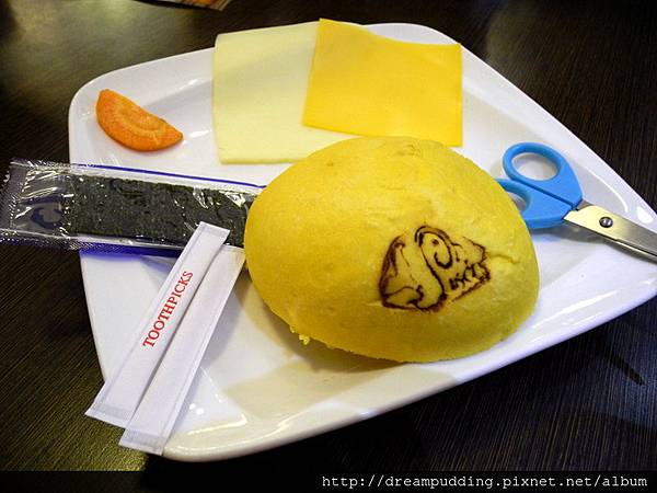 老皮面具的材料來了,黃色口味的是南瓜麵皮漢堡,上面還有店家的LOGO,還有起士片、蘿蔔、海苔、牙籤跟安全剪刀。