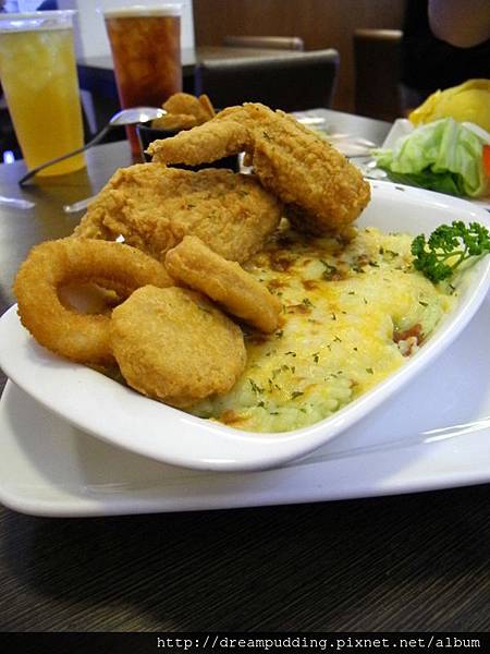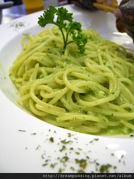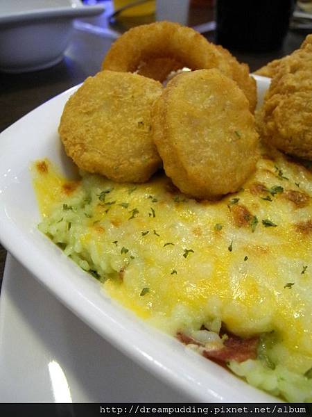 雞翅培根青醬燉飯,特別的是燉飯上面有一層焗烤,口感偏奶。