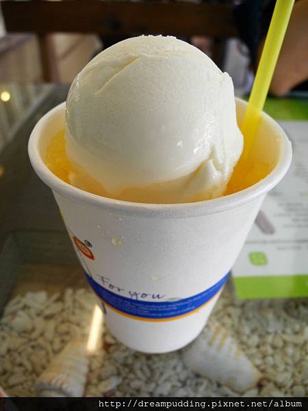 百香果雪泥+牛奶冰淇淋NT35元,我是非常怕酸的人,可是松盈的百香果雪泥喝起來酸甘酸甘的帶點微甜卻不膩口,清新自然;那個牛奶冰淇淋口感超濃郁,整體搭起來好棒,我很喜歡,我跟友人根本是欲罷不能的秒殺。
