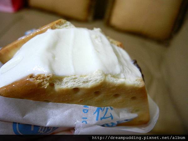 牛奶口味是我最喜歡的,一口咬下那扎實飽滿的口感真的很棒,有照到餅乾斷層面的這張照片,看的出來冰餅外皮一點都沒濕潤,所以才會咬起來是脆的,很神奇喔!