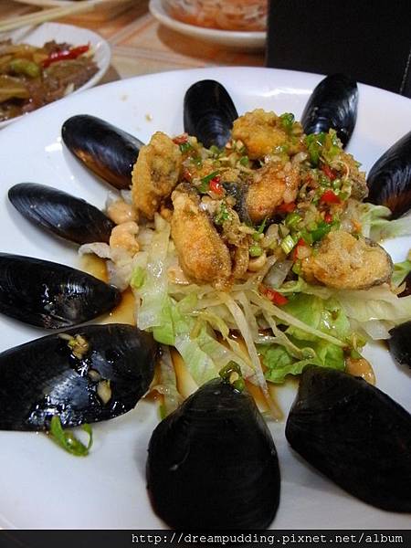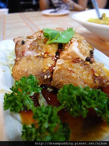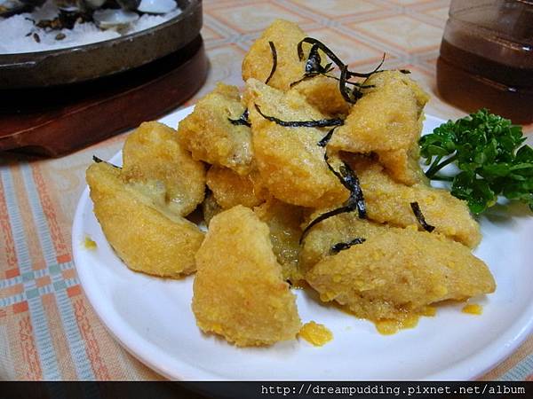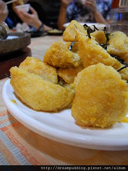 淋酥蠔,扇貝炸過之後佐上特製的蔥蒜醬汁,香脆花生及高麗絲為配菜,清爽不膩口。
