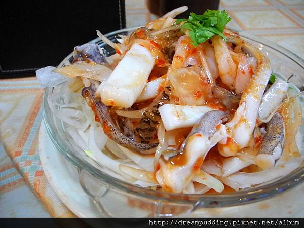 泰式涼拌海鮮,這是我每次來都必點的,海鮮料多又新鮮,魚皮跟花枝都Q彈,洋蔥絲也新鮮,泰式醬微嗆微辣,很開胃。