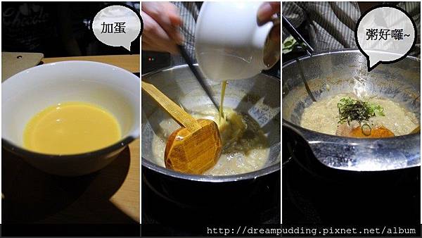 爾後當白米飯漸漸吸取湯汁時,再加入蛋液快速攪拌,最後再加入蔥及海苔絲調味。