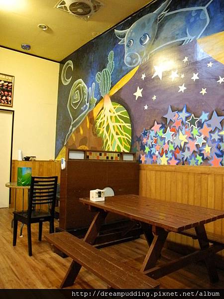 牆上的畫作是請一個畫家畫的,很引人發想的一幅畫作。主題是夢想,每樣生物都有他的夢想,只要勇敢地跨出第一步,夢想才能有開始實現的可能;色彩繽紛療癒,讓人很喜歡。