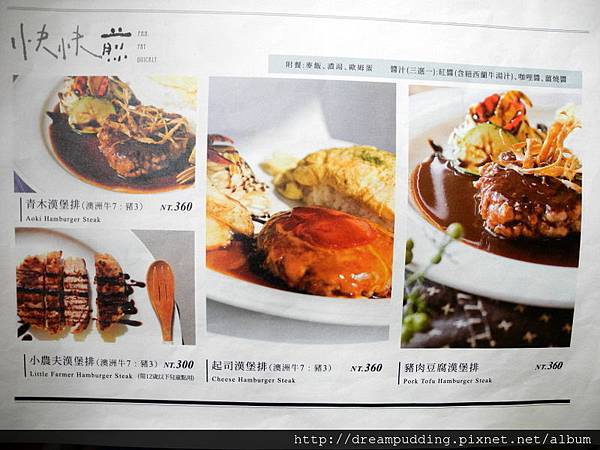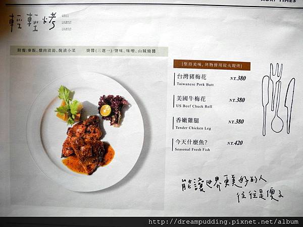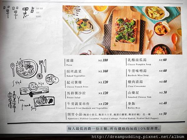 餐點主要分為4種料理方式,烤、煎、炸、煮,低消為一人一份主餐,加10%服務費。