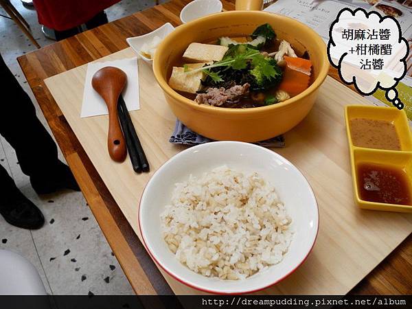 烏龍茶湯豬肉鍋,負賣飯、醃漬小菜跟柑橘醬還有胡麻醬,我很喜歡柑橘醬那清爽帶點甘甜酸的感覺,這樣會有種讓我好像吃很多都熱量很低的錯覺