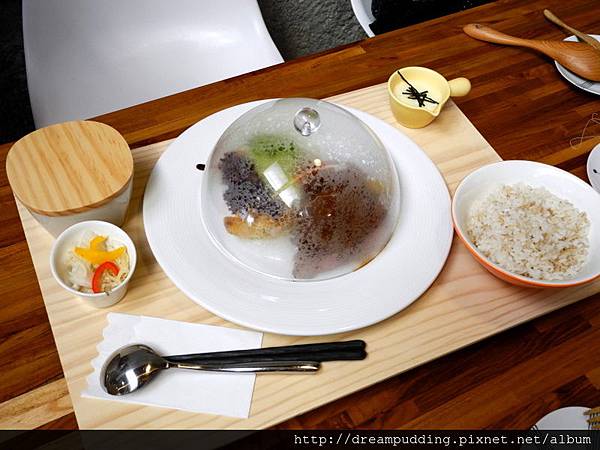 美國牛梅花,附麥飯、燉肉清湯跟醃漬小菜,看到那個金鐘罩,我也好想去買一個,這樣自己在家上菜,我的滷肉飯會幻化變身成肋排碎肉淋飯吧?????