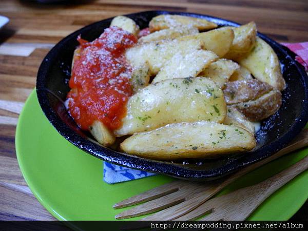 起士薯條,薯條是帶皮的大塊厚切馬鈴薯,起士味濃厚不膩,沾取自家熬煮的番茄醬,有著一絲清爽解膩。