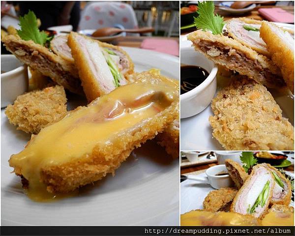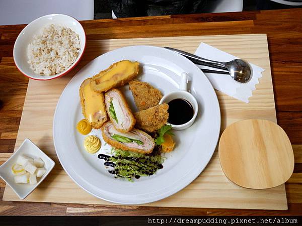 炸豬排有三種口味,一種有起士、一種是山藥蘆筍,另一個則是炸漢堡排,我最喜歡那個爆漿起士口味的,吃下去外酥內稠滑且濃郁,很幸福。