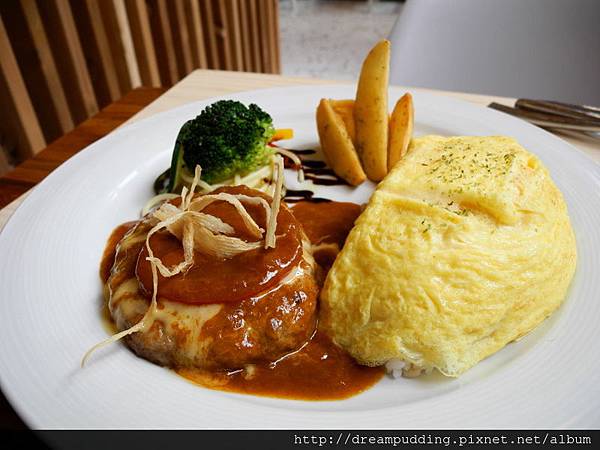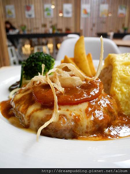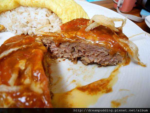 起士漢堡排,澳洲牛7豬3的比例。歐姆蛋下面蓋著的是份量多的麥飯,附的是濃湯。