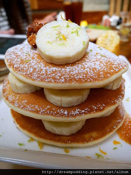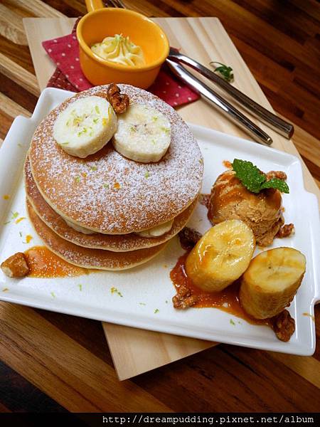 焦糖香蕉鬆餅,除了有三層高層疊的鬆餅,還附了淋上焦糖的香蕉塊及一球焦糖慕斯。