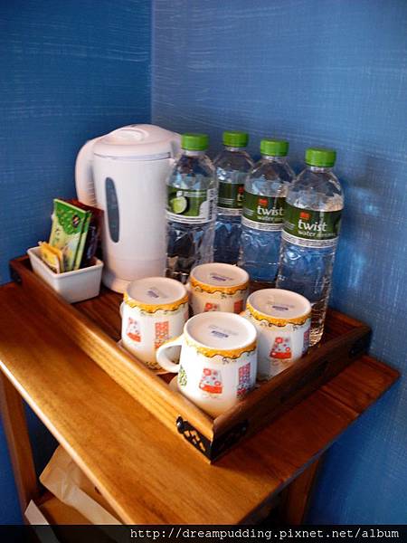配備很齊全,有礦泉水跟茶包還有電熱水壺以及漱口杯,洗髮精跟沐浴乳還有肥皂也有。