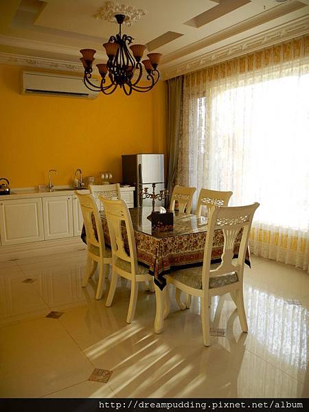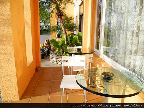 橙堡有兩棟,較靠近門口的是羅浮宮,中間是早餐的用餐區,也是橙堡主人居住的地方,裡面的那一棟是凡爾賽。兩棟的門口都有休息的桌椅,所以半夜坐不著覺,不用到屋頂哼歌,在樓下吹著涼風也很愜意啦。