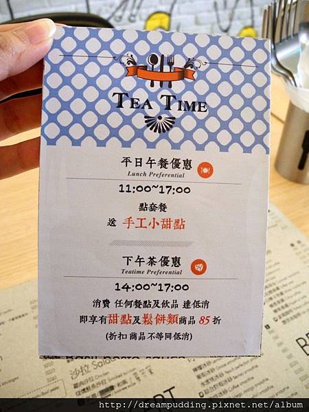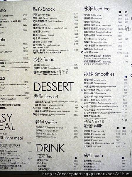 有義大利麵、燉飯跟比薩還有一些小點心,義大利麵有奶油、青醬、紅醬跟蒜香。由於麵飯分量屬適中,所以提供了加飯加麵選擇,只要加30元,而墨魚燉飯由於採黃金比例,所以目前沒提供加飯加量的選擇。加70元升級套餐附濃湯跟麵包以及折抵任一飲品50元。