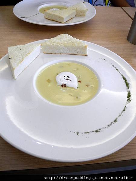 濃湯微濃微稠,料很多,有略略濃郁的奶油味,挺好喝的;麵包微微的烤過,帶著些些細微的蒜香。