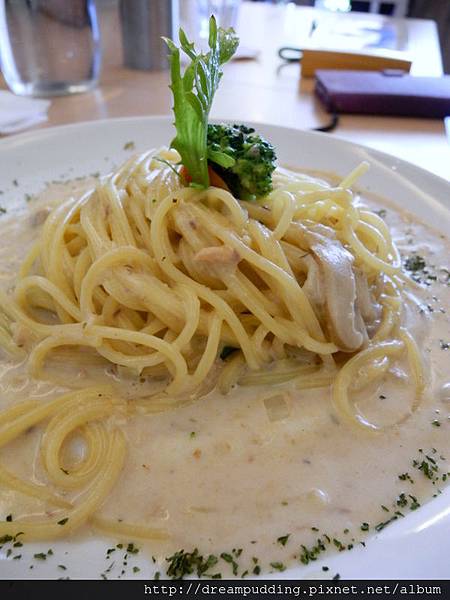 奶油鮭魚蘆筍義大利麵,單點220元,由於現在不是蘆筍的季節,所以蘆筍換成了青花椰。這道特別的是,是將鮭魚弄成碎肉和成醬汁,所以每一口都有鮭魚跟奶油醬汁濃郁的帶點自然微鹹微鮮的風味,卻吃不到大塊的鮪魚肉,[看沒有鮭魚卻吃有鮭魚]的感覺。