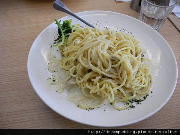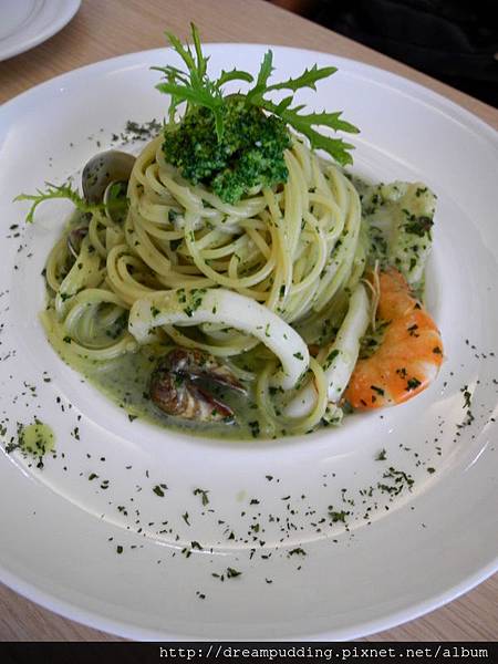 青醬海鮮義大利麵,單點230元,阿聖小兄弟點的,他離我太遠了,所以我完全忘記要跟他夾一大口來嚐味道