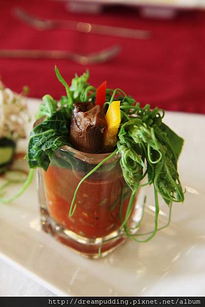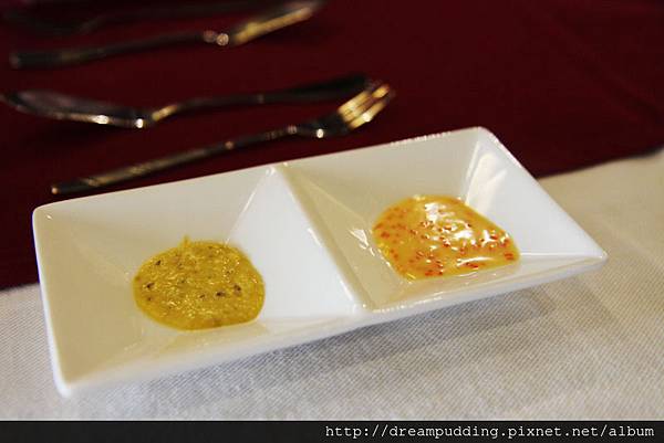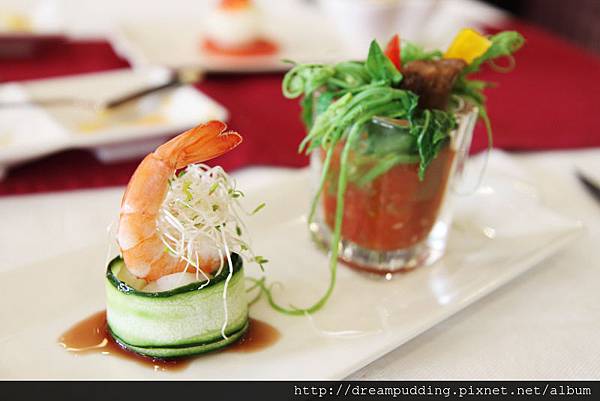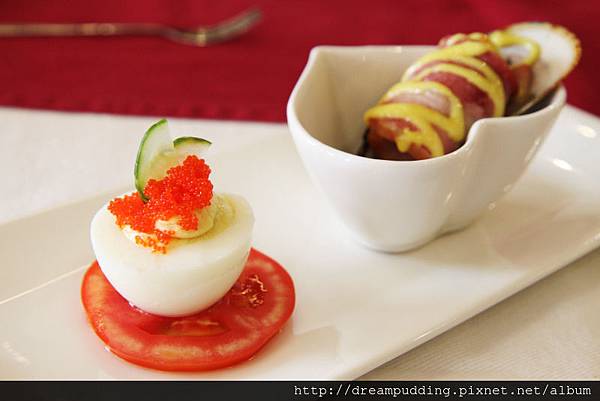 開胃小品,明太子蛋圈塔&法式培根淡菜,那個水煮蛋裡面有奶油加蛋黃打成的綿細慕斯,嘗起來香甜,我很喜歡;後方的淡菜加培根一塊吃,鮮鹹中和,讓嚐起來的味道感覺平穩。