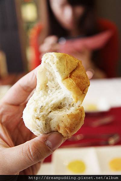 有脆皮法國麵包跟迷迭香法式餐包,我喜歡迷迭香的那個,口感鬆軟,可在撕拔的時候有著些微的韌性,帶點淡淡的香料味,溫熱可口的很好吃。