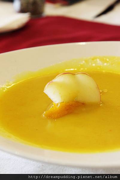 香蘋南瓜濃湯,裡面也有一大丸的南瓜泥,口感濃厚中帶有一絲清爽跟隱隱約約的蘋果香氣,索爾哥很喜歡。