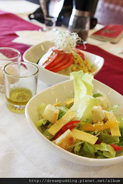 地中海乳酪沙拉&油醋醬,由於沙拉已經有事先拌過油醋了,所以若是覺得味道不夠可再加附的油醋醬,生菜新鮮還有我喜歡的烤過微酥脆的麵包丁。