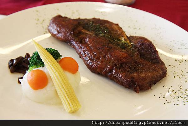 義式香料佐丁骨豬排,一旁的配菜有棉柔細滑的馬鈴薯泥,還有清甜的玉米筍跟花椰菜<-----這一區看起來好像冰雪奇緣裡面的雪寶