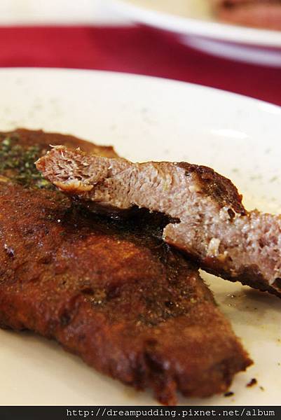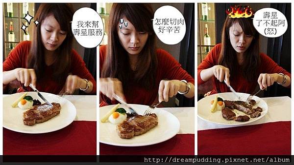 是說我本來想說索爾哥是壽星還要拍照很辛苦,所以我很賢慧的要幫他切肉,可是我還真沒有切肉的天分,才一下下就遇到障礙,索爾哥可能怕我一怒之下把整塊肉拿起來啃,怕他自己沒肉吃,所以我才切兩下,他就趕緊把肉整盤端過去了,不想讓我表現。