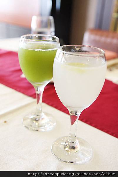 飲料白色的那杯是香檸杏仁飲,加了檸檬讓杏仁的獨特味道些微的降低;綠色的是鳳梨青梅蜜,喝起來酸甜甘。