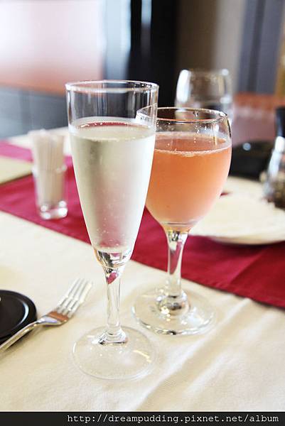 餐前酒,前方的透明液體那杯是清爽帶點微甜果香的水蜜桃氣泡酒;後方那杯則是不含酒精的愛慕斯特調,酸甘酸甘的。
