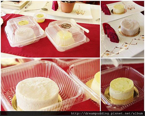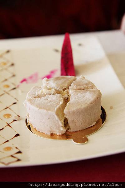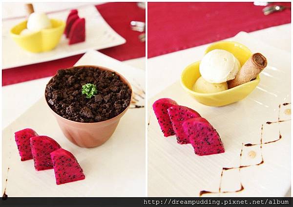 左圖的盆栽上面是巧克力碎,底部是滑嫩軟的像奶酪的布丁;右圖是冰淇淋,火龍果很甜。
