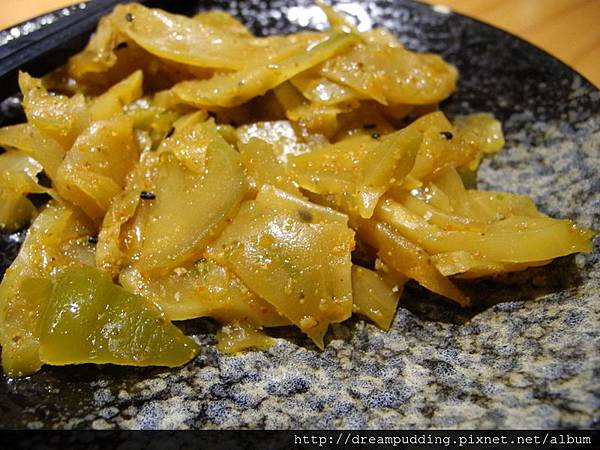 小菜,醃漬榨菜,帶點辣,口味比較重,微脆。