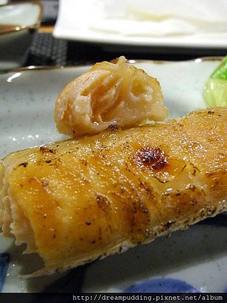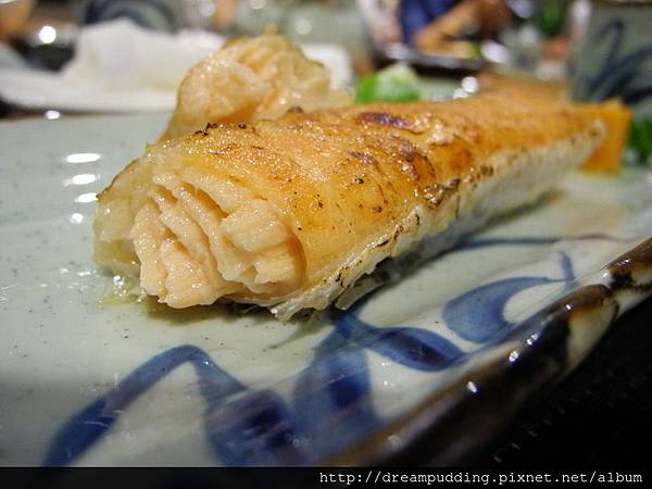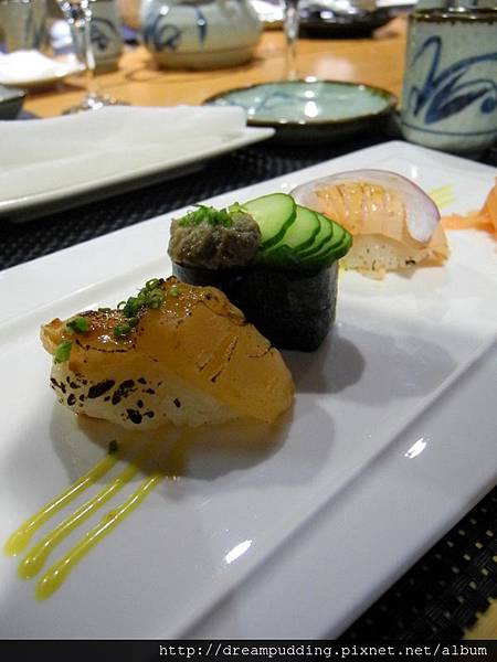 炙壽司,炙干貝、蟹膏軍艦、炙鮭魚,干貝很大一顆,一口咬下有海鮮的鮮跟炙燒過的香氣;蟹膏口感濃郁;鮭魚是我的最愛,肥的富含油脂的魚類都是我的最愛^^