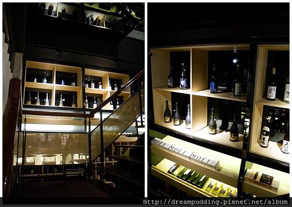往2樓的樓梯邊展示著好多酒,酒類品種也豐富喔!