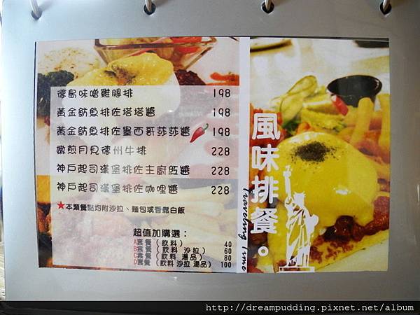 套餐加購分四種方式,A套餐加40元有飲料、B套餐加60元有飲料跟沙拉、C套餐加80元有飲料跟湯、D套餐加100元有飲料跟沙拉及湯品。