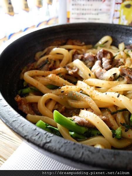 烏龍麵Q,略彈,加了山茼萵增加清爽,壽喜燒醬汁微鹹微甜的,整體搭起來很不錯吃。