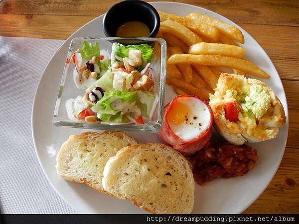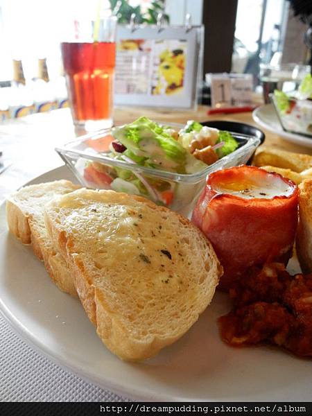 旅食綜合雙城塔,在選擇這系列早午餐時我掙扎了好久,因為我想選培根蒸蛋,又想要吃由麵包酥烤而成的什錦塔,還好甜美的服務生跟我說可以點雙城塔就可以一次吃到兩種口味,所以後來就點了這個一種價格但是有雙重享受的雙城塔。