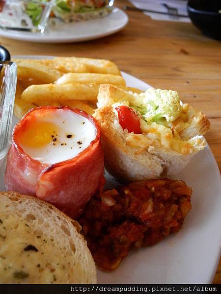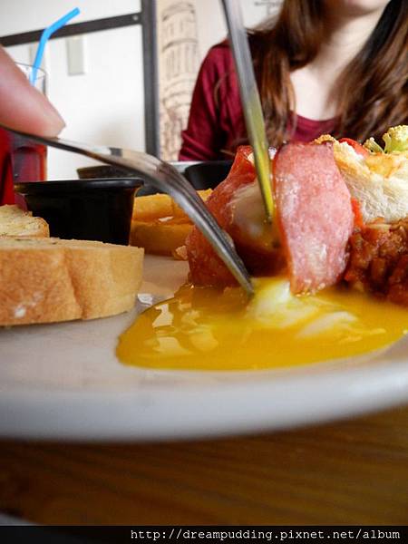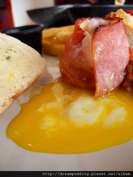 這個培根塔就超誘人的,把蛋打在培根裡讓他慢慢熟,培根的圍牆一被切開,蛋液就滾滾如黃河了。