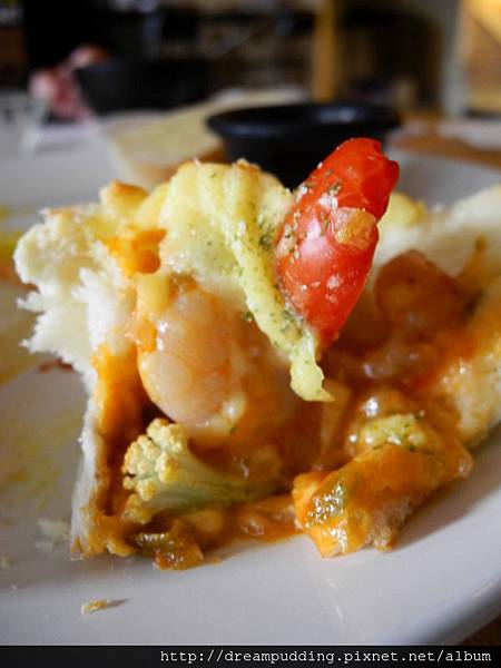 什錦塔外層是烤到微酥的軟法,內餡這天是白花椰菜跟蝦仁還有一些蔬菜,口感外酥內濃郁,還有蔬菜跟醬汁融合的汁液,我覺得還挺不錯吃的。