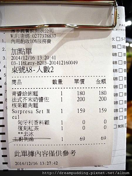 這個價位在台北來說算很平價,難怪生意好好,我看很多人都有加259元升級有甜點的套餐,看了一下別桌的發現他們的甜點也不馬虎,不過259套餐雖然有一道開胃菜、一個點心還有35元飲料跟甜點,我還是覺得套餐價位有點高,因為這樣就比單點一份義大利麵還貴了,是說就算加259元套餐整體吃起來也差不多400~500多,所以好像也還OK喔,哈。