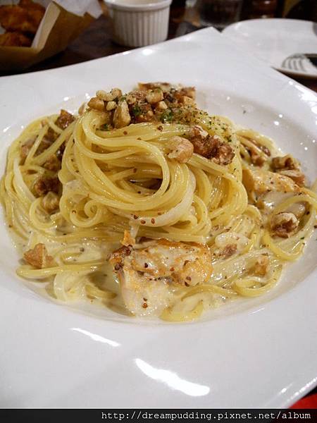 味道濃郁,醬汁都有巴在義大利麵上,要趕緊吃,不然到後面吃會略為稠,口感還挺不錯,醬汁的味道都有跟麵融為一體,份量有多,核果粒增加了口感,麵條屬於軟的,但還不會到很軟。