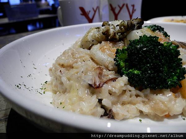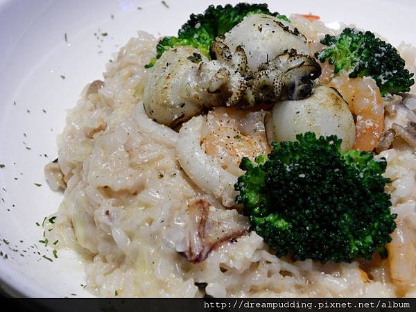 用料很實在,除了有蝦子跟烏賊圈之外,還有碳烤過的小花枝,燉飯不是有米芯的那種,可也不會到過於軟,雖然有點濕潤,但微微的緊密,奶味也不會過於厚重,好吃。
